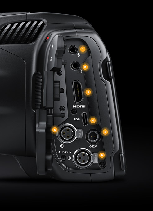 Embora pequena e portátil, a Blackmagic Pocket Cinema Camera possui uma ampla variedade de conexões para áudio, monitoramento, alimentação e muito mais. A câmera inclui um conector HDMI de tamanho normal para monitoramento com suporte para HDR e saída limpa de 10 bits. Isso significa que você pode conectar um monitor HDMI para monitoramento de imagem no set, com ou sem sobreposições que mostram informações críticas e o status da câmera. Há também uma conexão mini XLR com alimentação phantom de 48 volts para conectar microfones profissionais, uma entrada de microfone estilo camcorder de 3,5 mm, fone de ouvido e um conector de alimentação DC com trava profissional. A conexão USB-C permite que você conecte e grave diretamente em sua unidade multimídia.